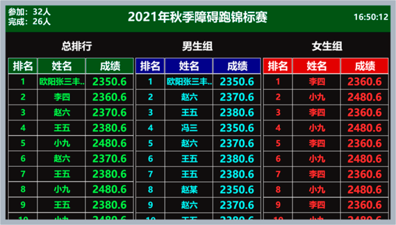 为最大化满足课程趣味性,可使用大屏显示实时排行,大屏支持在低分辨率的LED屏幕使用,支持嵌入式LED控制软件转播。