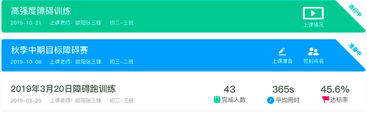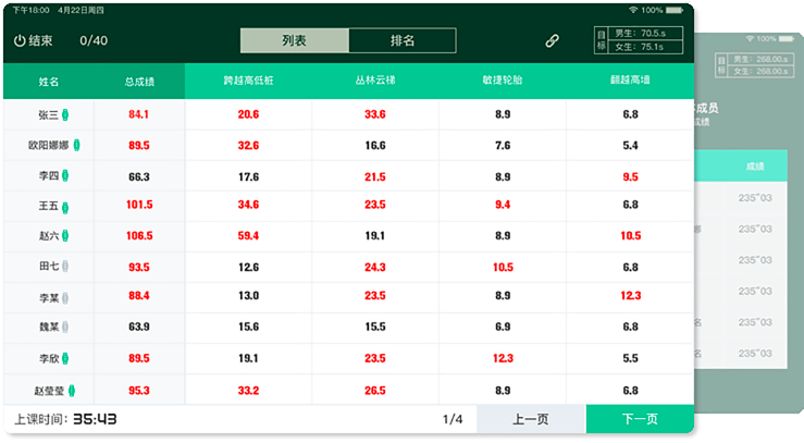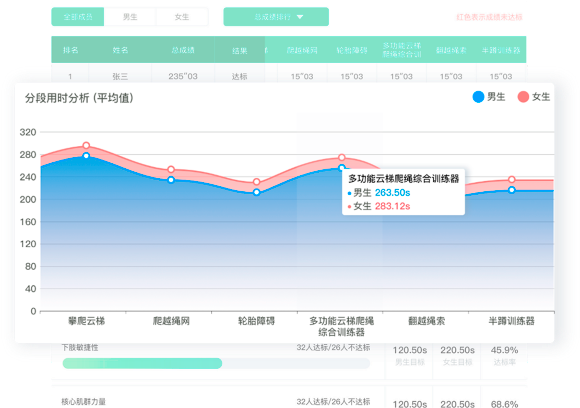 记录每一堂体育课程,自动统计用时、达标率、完成度、和排行等数据,高效助力体育老师完成课后统计。