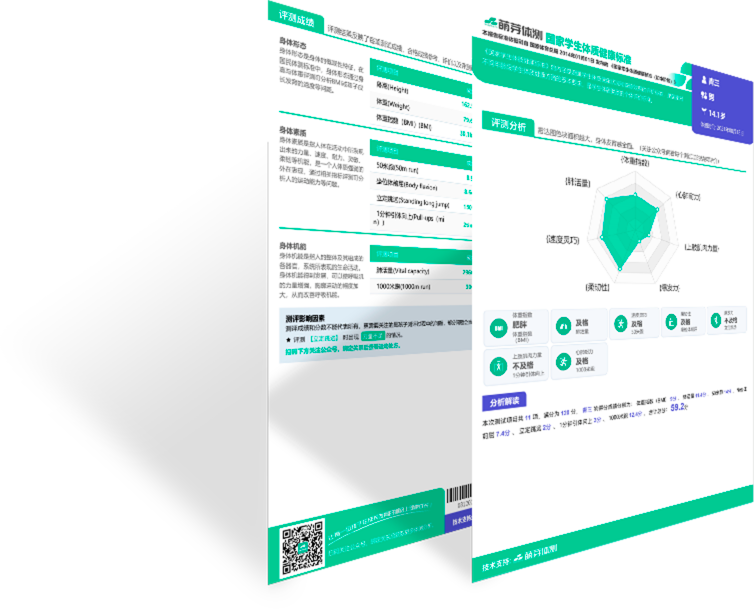 自动生成标准化测评报告,呈现测试综合分析、测试成绩以及同性年龄的参考标准等分析情况。