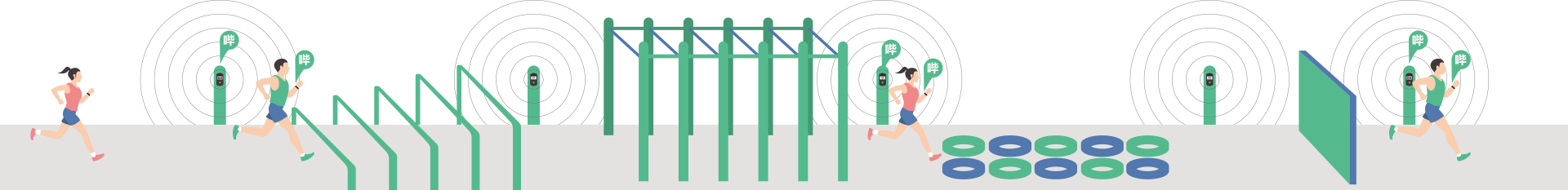 综合体能评估属于特色干预课程,不仅能磨炼学生身体素质和顽强的意志,而且还要求掌握正确的器械使用技术,可以发展耐力,提高身体机能,培养勇敢顽强和不怕困难等优良品质,可以根据体育教学策略,选择不同功能的器材进行场地建设。